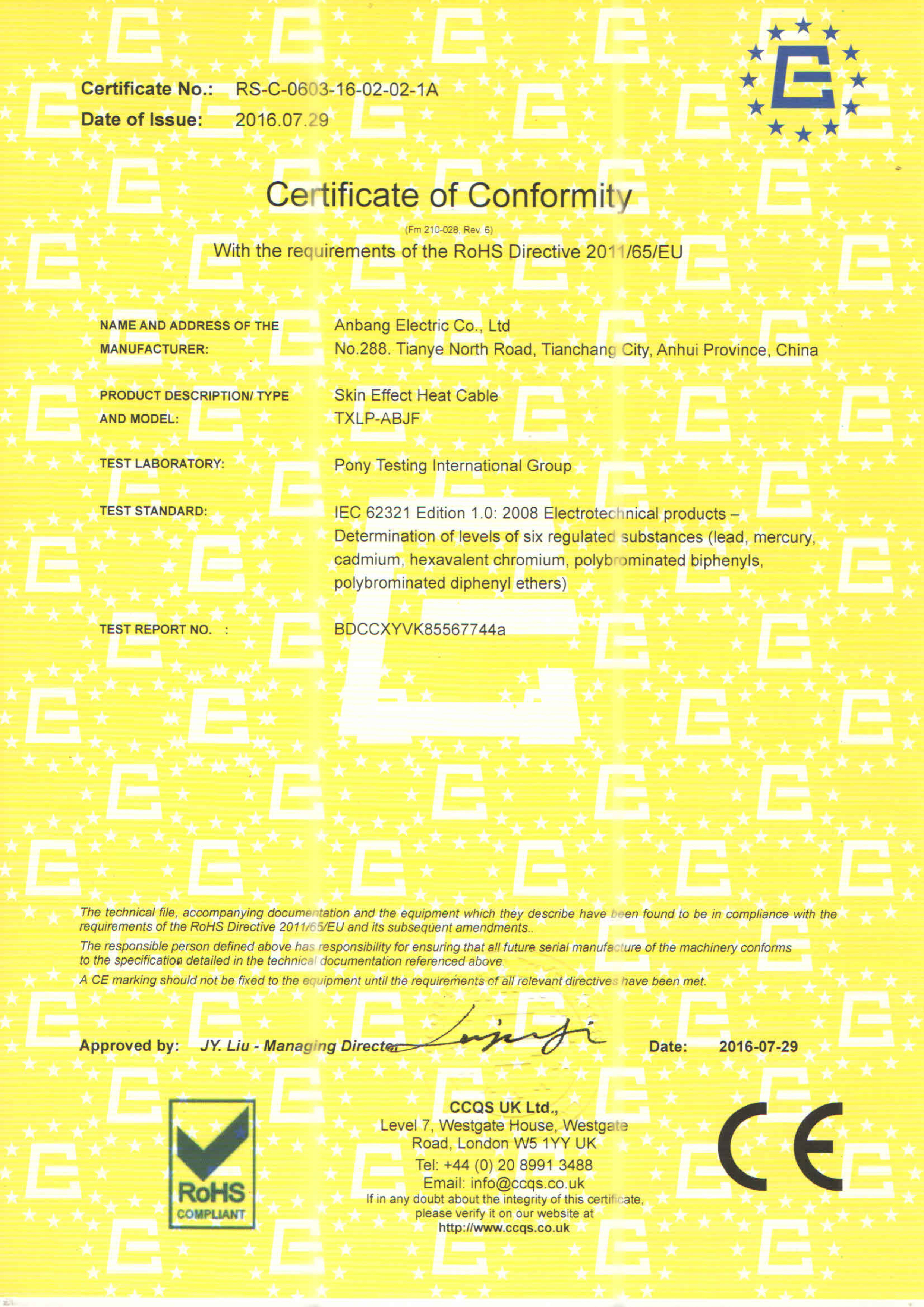 安邦電氣股份有限公司,總部位于北京市長安街,成立于2004年,注冊資金10088萬。安徽生產(chǎn)基地占地面積63000平方米,擁有66套各類生產(chǎn)線,其中進(jìn)口生產(chǎn)線6套。國家高新技術(shù)型企業(yè),滁州市市長質(zhì)量獎企業(yè),專精特新“小巨人”企業(yè),擁有國家知識產(chǎn)權(quán)局授權(quán)的45項專利,其中發(fā)明專利28項 , 主筆《太陽能熱利用自限溫電熱帶安裝規(guī)范》行業(yè)標(biāo)準(zhǔn),參編《自限溫電伴熱帶》國家標(biāo)準(zhǔn)、《工業(yè)和商業(yè)用電阻式伴熱系統(tǒng)》國家標(biāo)準(zhǔn)、《太陽能熱利用自限溫電熱帶》行業(yè)標(biāo)準(zhǔn)、《爆炸性環(huán)境 電阻式伴熱器》國家標(biāo)準(zhǔn)等7項國家標(biāo)準(zhǔn)。企業(yè)通過UL認(rèn)證,國家強(qiáng)制性 CCC產(chǎn)品認(rèn)證,ISO9001質(zhì)量管理體系認(rèn)證,ISO14001環(huán)境管理體系認(rèn)證,ISO45001職業(yè)健康安全管理體系認(rèn)證,Q/SHS0001.1健康、安全與環(huán)境管理體系認(rèn)證,歐盟防爆ATEX認(rèn)證,歐盟CE認(rèn)證,RoHS認(rèn)證,俄羅斯海關(guān)聯(lián)盟認(rèn)證,國家防爆電氣CCC證書。產(chǎn)品系列:集膚伴熱系統(tǒng)、電伴熱系統(tǒng)、電加熱器、電地暖系統(tǒng)、集儀器儀表、電線電纜、高低壓配電柜(箱)、電纜橋架、閥門管件等等設(shè)計、制造、銷售。產(chǎn)品應(yīng)用于航天航空、軍工、石油、石化、天然氣、機(jī)場、化工、鋼鐵、隧道、消防、養(yǎng)殖、融雪化冰、室內(nèi)供暖、國家電網(wǎng)及眾多電廠等等國家重點(diǎn)工程。出口美國、英國、德國、俄羅斯、韓國、日本、哈薩克斯坦、烏克蘭、伊朗等眾多國家。